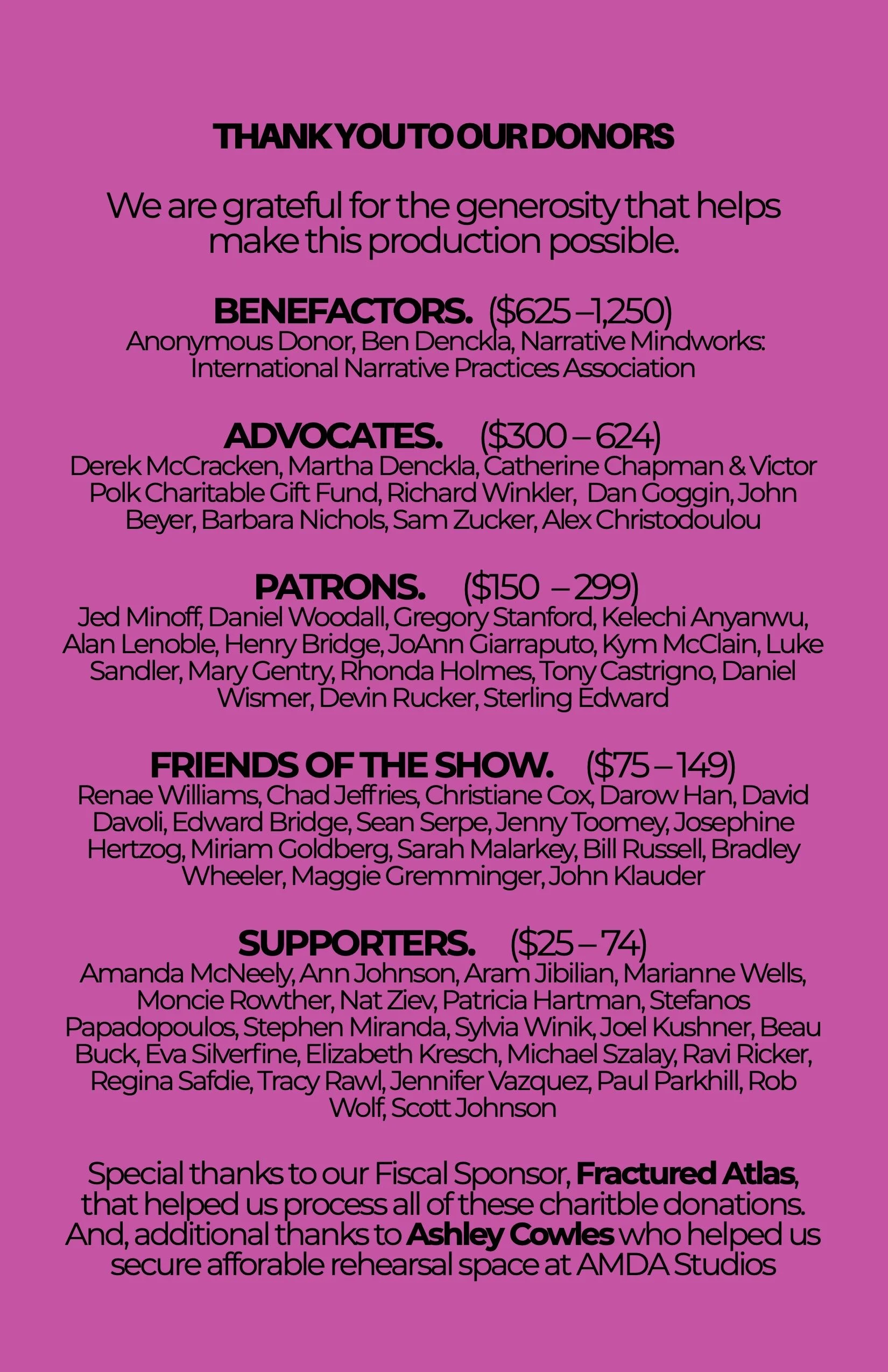 All donations are tax-deductible through our fiscal sponsor, Fractured Atlas (a 501(c)(3) nonprofit).
